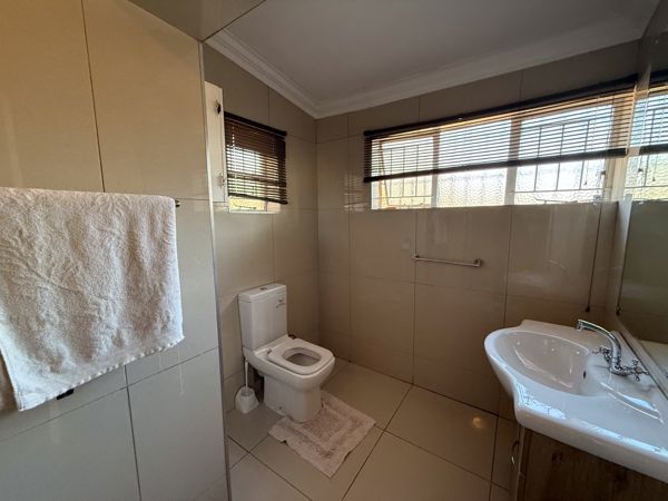 A well-proportioned kitchen with multi-functional cabinetry flows effortlessly into an open-plan living and dining area, featuring immaculate tiled floors, air-conditioning, and a striking modern fireplace. There's even enough space to create a second lounge or a dedicated work-from-home zone.